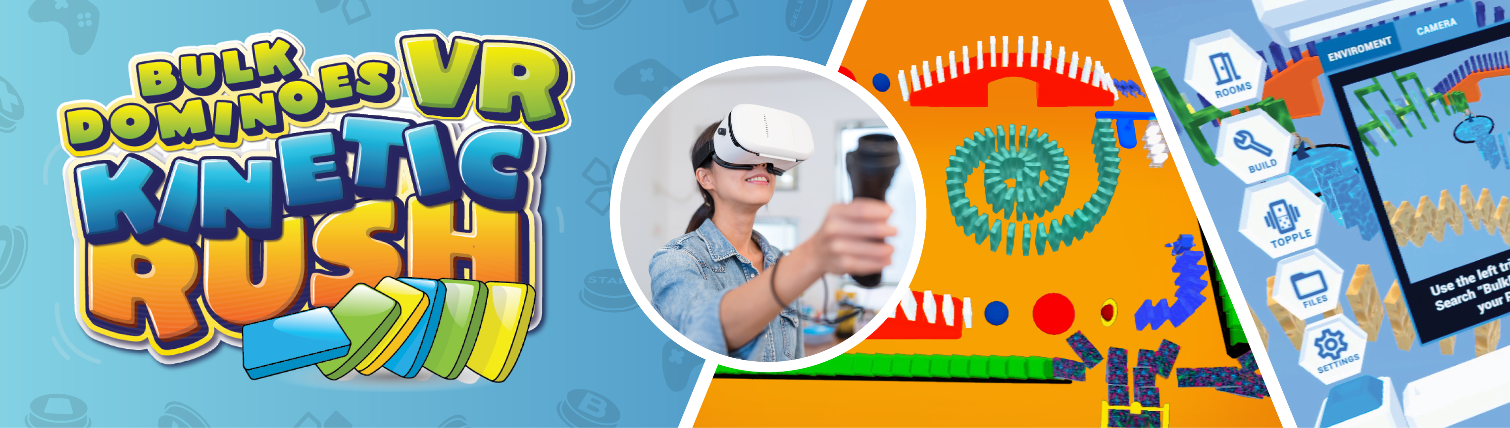 Have you ever wanted to setup thousands of dominoes? Well, we brought Bulk Dominoes into the digital age with Bulk Dominoes VR: Kinetic Rush. This Fast-paced, creative VR experience lets you build and topple thousands of dominoes in a fully immersive virtual world. Design elaborate chain reactions, watch them fall in satisfying cascades, and reset your creations instantly with the press of a button. It's fun, intuitive, and removes the stress of accidental knockovers, making it the perfect way to enjoy the magic of domino toppling without limits.